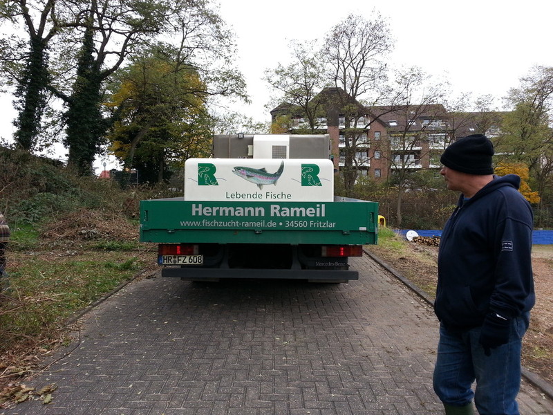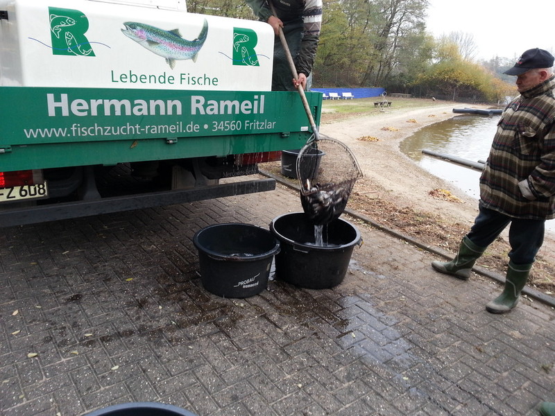 In jedem Herbst werden vom Verein Besatzmaßnahmen im Rahmen des 5-Jahresplanes durchgeführt. Der LKW der Fa. Rameil aus Fritzlar kommt, wie wir es seit Jahren gewöhnt sind, pünktlich am Gewässer an.