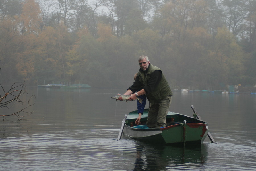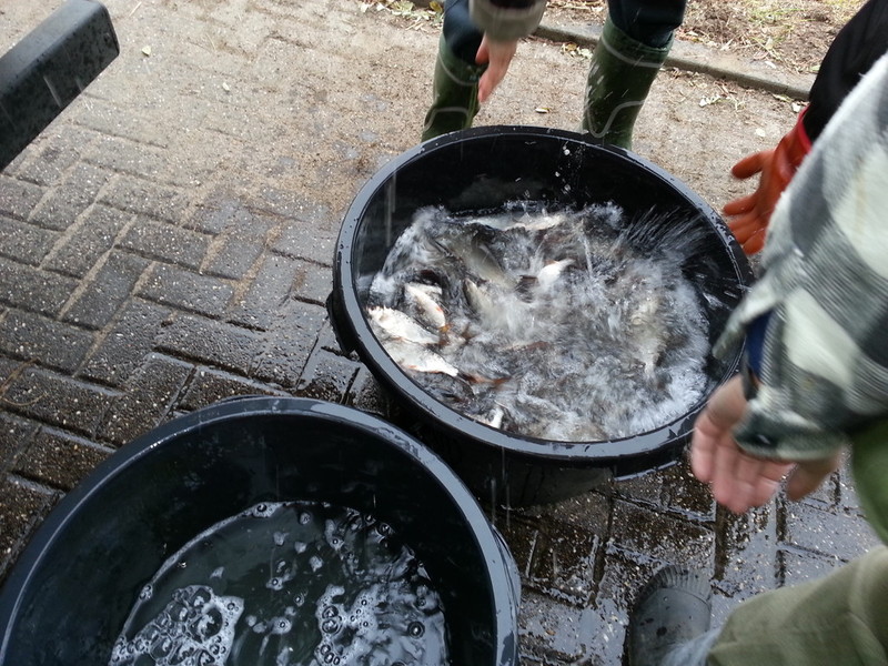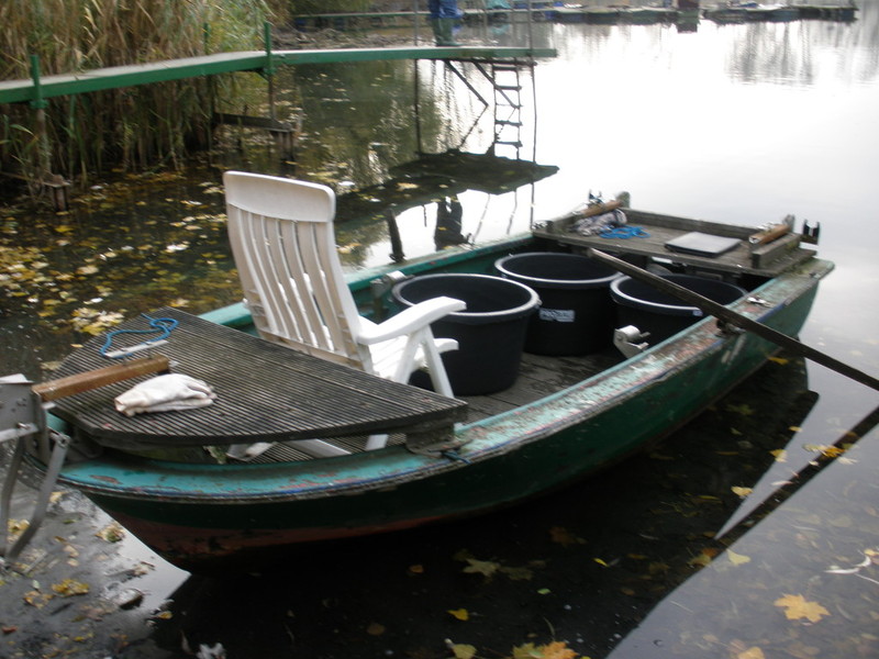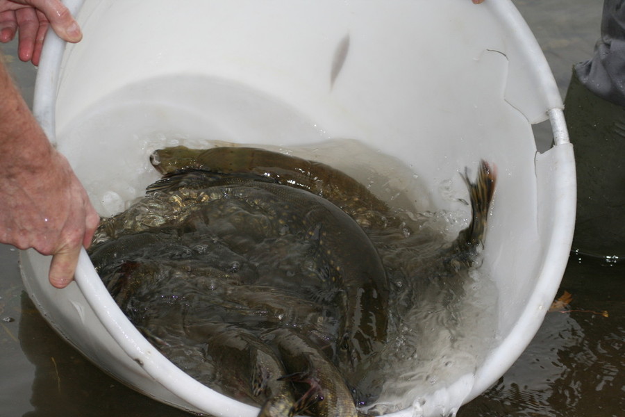 100 Hechte und 350 Schleien sollten über das ganze Gewässer verteilt werden. So wurden die Fische in den Kübeln auf die 4 Boote verteilt und jedes Boot fuhr eine bestimmte Uferstrecke ab. An den besonders günstigen Stellen, die den Fischen Schutz und Unterstandmöglichkeiten bieten, übergaben wir die Hechte einzeln und die Schleien zu mehreren ihrem Element.