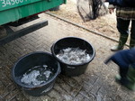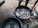 400 Kg Rotaugen wurden vorsichtig mit großen Kübeln am Strand des Freibades ins Wasser verbracht.